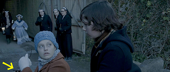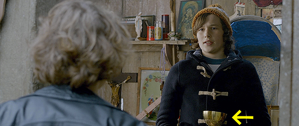 場面は、翌日の警察署に変わる。バートとピーターが取り調べ用のテーブルに座り、テーブルの上には聖杯が置いてある(1枚目の写真、矢印、後ろにいるのは、バートの母と伯父、見えないがピーターの後ろには彼の父親もいる)。警官は、「誰がやったんだ?」と鋭く訊く。母も、「バート、正直に話して」と言い、伯父も、「バート、真実を述べなさい」と言う。バートは、ピーターを庇うため、「僕達、一緒に盗みました」と嘘をつく(2枚目の写真、矢印は聖杯)。「僕が、ツリーハウスに隠しました」。伯父は、ピーターの父親の前まで行くと、「あんたは、こんな息子を持ったことを恥じるべきだ」と責める。父親は無言のまま立ち上がると、ピーターに「行くぞ」と声をかけ、ピーターは、平然と、「お金、返してもらったら?」と言う。2人が署から出て行くと、伯父は、「なぜ、あの少年を庇うんだ?」と訊くが、バートは答えない。