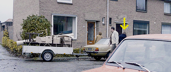 別な日、教会からの帰り、バートがフェハイユ邸の前を通ると、救急車が停まっている。モニクが病院から戻ってきたのだ。それと同じ日かどうかは分からないが、バートは、何もなくなった自分の部屋を眺めている。鞄を持って居間に行くと、空っぽになった部屋の中で、父がパイプチェアに座ってタバコを吸っている〔父も退院している〕。如何にも鬱病患者といった感じ。妻に促され、家を出るために立ち上がる。次のシーンでは、家の前に家具を積んだ台車付きの車が停まり、近所の人がさよならを言いに集まっている(1枚目の写真、矢印は鍵を閉めるバート)。前に伯父が結婚式で述べた「職を失い、財政的に行き詰まり、家を失う」が現実になった瞬間だ。母が運転して引越し先に向かう。着いたところは狭そうなアパート(2枚目の写真、矢印はバート)。中も恐ろしく狭い。父はまっすぐ中に入ると、先ほどと同じようにパイプチェアに座ってタバコを吸い始める。かなり重症だ。母は、「パパのことは心配しないで。薬がまだ効いていないの」と、バートを慰める。