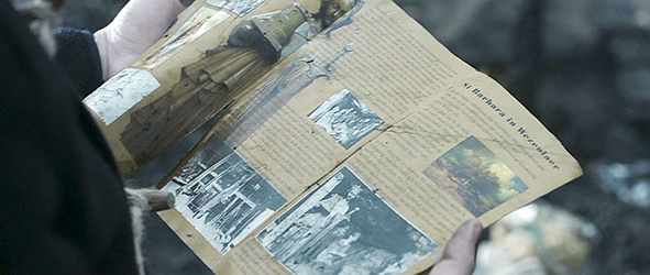 バートは、溜まったストレスを赤ワインのラッパ飲みで解消する〔ワインは2本ある〕。酔っ払ったバートは、木の上の台から、ピーターに向かって、「汝、バート・ヘーラッツと付き合うなかれ。父親は気が狂い、バートは罪をもたらすであろう。この小さき変質者は、汝の姉と床を共にしたのだから」と叫ぶ(1枚目の写真)。ピーターの方も、「俺は、これまで悪いことは考えなかったけど、一丁やってやるか」と言うと、礼拝堂の中に入って行き、マリア像を手に取ると、「いいおっぱいしてるじゃないか。一緒に踊ろうぜ」と言いながら何かしようとして、手にも持っていたランタンを床に落す。すると炎が燃え上がる。バートは、「奇跡だ! 燃える柴だ!」と叫ぶ〔出エジプト記3章にある「主の使は、柴の中の炎のうちに彼(モーゼ)に現れた。柴は火に燃えているのに、その柴はなくならなかった」による〕。しかし、バートが礼拝堂に入ってみると、火はあちこちに燃え拡がり始めていた(2枚目の写真)。火の勢いはどんどん激しくなり、バートは伯父の聖杯を救い出すこともできなかった〔ように見える〕。そして、逃げ出した2人は、礼拝堂が燃え尽きるのを呆然と見ていることしかできなかった(3枚目の写真)。