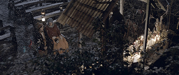 トンネルはかなり長かったようで、2人がトンネルの出口まで来ると、外はもう真っ暗になっていて、雪が降りしきっている(1枚目の写真)。バートは、多数のロウソクに囲まれた聖バルバラ像の前まで行く。そして、イスに座る。何も起きないので、モニクが、「それで?」と訊く。バートは、イエスに頼らざるを得なくなる。そこで、「主よ、私は自分の屋根の下にあなたをお迎えするほどの者ではありません。ただお言葉を下さい。そうすればモニクは癒されるでしょう」と唱える〔マタイによる福音書の8章の変形〕。何も起きない(3枚目の写真)。「神様… 彼女を助けて… 死なせないで… あなたは愛でしょ… なら示してよ」。何も起きない。