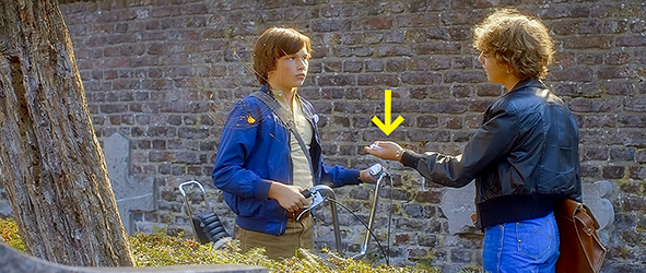 ピーターはバートと一緒にコンビニのような店に入る〔チェーン店ではない〕。ピーターは、お菓子の棚から勝手に幾つか拝借してポケットに入れながら、「姉さんは、タバコを欲しがってる。それと、見つからないよう見ててくれ」と言う(1枚目の写真)。レジにいた3人の話好きが去り、レジ係の女店主が、「何にする?」とバートに訊く。「タバコを1箱、お願い。父さんのです」。店主が、1箱取り出すと、それを見ていたピーターが、「ベリンダ」と、別の銘柄を指定する。バート:「ベリンダにして下さい」。「赤か緑のどちら?」。ピーターが、「緑」と言う(2枚目の写真)。「緑にします」。「お父さんに、緑のベリンダね? 他には何か?」。ピーター:「それだけ」。バートが、「それだけ」と言い直す。店を出たバートは、「どうかしてるんじゃないか? 盗みは罪だ」とピーターを責める。「お前だって、見張ってたじゃないか」。「君を助けただけだ」。「許されないことは、何もしないのか?」。「しない」。ピーターは、「なら、タバコを寄こせ。俺から姉さんに渡す〔I'll give them to my sister/Geef ik ze wel aan mijn zus〕」と言うが、この台詞は間違っている。「なら、タバコを受け取れ。お前から姉さんに渡せ」と言うべきだ。なぜかと言えば、この台詞を言う時、ピーターは既に左手にタバコを持っているし(3枚目の写真、矢印)、その後、バートが姉モニクに渡す時も、ピーターから受け取った形跡は全くないからだ。