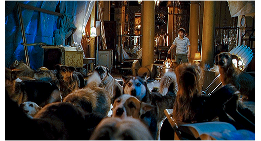 犬のホテルで一番大掛かりなイベント。きれいに掃除された大食堂にテーブルが一直線に並べられ、その両側に置かれたきれいなイスに犬たちが座る。その端には、テーブル列と直角に5人の食卓が置かれ、厨房から出してきた銀食器が並ぶ。その真正面、長いテーブル列の反対側には大きな機械があり、定時になると勝手に動き始め、一定間隔に並んだ餌皿にドッグフードを定量だけ入れていく。その皿の乗った長い布ベルトを引っ張るのは、玩具の機関車(1枚目の写真、矢印は進行方向)。汽車が反対側に着くと、完成を記念して、製作者のブルースが水の入ったグラスを掲げ、「僕らのホントの家族に」と乾杯の音頭をとる(2枚目の写真)。そのあと、全員でグラスを合わせ、犬たちも一斉に食べ始める(3枚目の写真)。