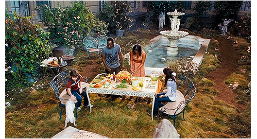 バーニーの奥さんは、2人に、「あなたたちはヒーローよ。頑張ったわね〔You should be proud〕」と褒める(1枚目の写真)。バーニーは、「君らを欲しいと思う里親はまだ見つからないんだ」と言った後、「だが、いい知らせもある。養子に欲しいと願ってるホントの両親を見つけたんだ」と驚かせる。「素敵なママで、先生をしてて、子供のことがよく分かる」。ここで、奥さんが代わる。「パパは、料理がからきしダメ〔cannot cook to save his life〕。アメフト・ファンで、TV見ながら、選手に聞こえんとばかりに叫ぶの。でも、とっても思いやりがあるわ」。ここまできて、2人は、養子にしたいと思っているのがバーニー夫妻だと気付く。アンディ:「犬は好き?」。夫人:「大好きよ」。4人は抱き会う(2枚目の写真)。この後、模様代わりした「犬のホテル」が映像で紹介される。映画の最後は、ホテルの屋上庭園でのバーベキュー。テーブルの前にいるのは、バーニー夫妻とアンディとブルース。この映画の冒頭に流れた「幸せそうな一家の人形」の再現だ(3枚目の写真)。