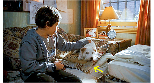 2人はホテルに駆けつける。部屋に入って行っても遠吠えはやまないが、ひょっとしたらとアンディがロールスクリーンを上げると、ぴたりと鳴き止む。要は、昨夜、余計なことをしたのが災いしたのだ〔それまでずっと開きっ放しだったのに、人間がいるかのように勝手に閉めた〕。ここで、コンメタリー。大型犬の遠吠えは、音響効果だとか。ところで、3匹の犬は、2人が決死の思いで持ってきた食べ物を食べようとしない。里親の家の食べ物が如何に不味いかが分かる。ブルースは、「レニーとジョージアったら、触ろうともしない」と驚く。「ホントのドッグフードを手に入れないと」(1枚目の写真、矢印はフライデー)。アンディは、食べないことより、犬の名前を問題にする。「ちょっと待って? 何て呼んだ?」。「レニーとジョージア。名前付けたんだ」。「名前なんか付けちゃダメ。情が移っちゃうわ」。アンディは、1匹でも大変なのに、3匹も面倒は見られないと言うが、ブルースが持参したクッションの上にフライデーが嬉しそうに座ると、何とも言えなくなる。「僕が 静かにしてるよう見てるから、お姉ちゃんはホントの食べ物を調達してきて」。「分かった、だけど、これっきりよ」。アンディは、一昨日訪れたペットショップに行く。店番のデイヴが、さっそく話しかけてくる。アンディが大袋を見ていると、「それ、40ポンド〔約18キロ〕入りだよ」と驚く。アンディが持ってきたビラが小型犬だったので、大きすぎると思ったのだ。アンディは、他にも野良犬が2匹いると打ち明ける。そして、両親が犬好きで、庭も広いから、捨て犬を保護していると嘘までつく。デイヴは、その話に便乗しようと思い、店に置いている「引取り手のない犬たち」を預かってもらえないかと頼む。見返りは、ドッグフード。犬たちは、クーパー(ブルドッグ)、シェップ(ウェルシュ・コーギー・カーディガン?)(2枚目の写真)、ロメオ(チャイニーズ・クレステッド)の3匹。やむを得ず引き受けたアンディは、犬の形を模した店の専用車で、犬たちとともにデイヴに送ってもらう。アンディが連れて行った先は、放置されたホテルの裏口なので、デイヴも「何か変」だと思い始めるが、それでも一緒に中に入って行く。「ここ、安全なのか?」。「ええ、数日前から来てるわよ」。その時、犬を静かにさせようと、発明家のブルースが作った「投石機ならぬ投物機」から飛んできた柄杓(ひしゃく)がデイヴの頭を直撃する。アンディが第三者を連れてきたことに、ブルースはいい顔をしないが、「投物機」を褒められ、仲間として受け入れる。すると今度は、下階の方から女性の声がする。床の糞を踏んでしまって叫び声を上げたのだ。それは、同じペットショップに勤めるヘザーだった(3枚目の写真)。彼女も仲間として受け入れられる。