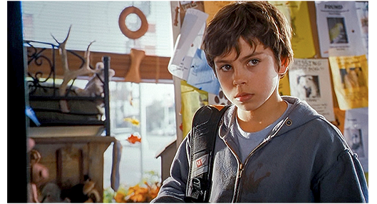 映画のオープニング・クレジットの最後に、庭でバーベキューをする幸せそうな一家の人形が登場する(1枚目の写真)。DVDのコメンタリーによれば、「画面に現れた両親の人形が意味するのは、この映画のテーマである『家族』のイメージだ。笑ってしまうほどに強調されているが、映画の主役である子供たちが持っていないものだ」とある。次に現れるのはフライデーという白い犬。テリアの一種だろうが、詳しいことは分からない。歩道の柵につながれていたが、綱を噛むと、上手に首輪を外してしまう〔伏線〕。この映画では犬のCGトリックは意図的に排除されている。次は、11歳のブルース少年が、携帯の箱のプラスチックの内箱にぴったりはまる石を詰め、蓋をし、公衆トイレの床に敷いた薄い透明フィルムを巻き付け、ハンドドライアーの熱でフィルムを箱に密着させている。これで、商品は新品に見える。中が石だとは誰も分からない。このシーン、ほとんどブルースの顔が映らないが、それは、代役を使っているからとか〔子役の労働時間が厳しく制限されている〕。完成した箱は、16歳の姉アンディに渡され、彼女はそれを質屋に持ち込む。そのあと、2人は町で合流する。「幾らになった?」。「27ドル」(2枚目の写真)。「密封包装だもんね」〔完全未開封〕。映画では、これだけだが、未公開シーンでは、アンディが200ドルで売ろうとするが、密封包装なので、買った店に返品しろと言われてしまう。レシートをなくしたと言い、100ドルに値下げするが、18歳以上には見えないからと突き返される。たまたま店にいた客が後を追ってきて20ドルなら買うと言う。2人は首輪が取れた状態のフライデーを見つけると、公園で餌を与えている。ブルース:「食べさせるのに、苦労してるの分かっててくれるかな」(3枚目の写真)。食べさせているのは、ドッグフードではなく、ファーストフードのハンバーグだ。