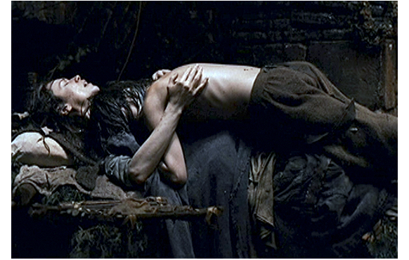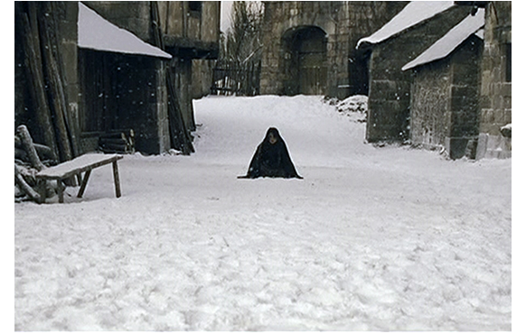 居場所のない2人。母はジャクーを伯爵の城が対岸に見える崖に連れて行き、「呪われるがいい、下劣なケダモノめ!」「石には石を! いつの日か、お前は滅び去るであろう!」「お前のすべてを、呪ってやる!」と叫ぶ。しかし、雨に打たれて衰弱し、廃屋に辿り着いた頃は高熱を出していた。「寒い」。「大丈夫だよ、母さん」。「離れないで」。「一緒だよ、母さん。ここにいるから」、と上半身裸になって、母を暖めるジャクー。しかし、翌朝には母は冷たくなっていた。