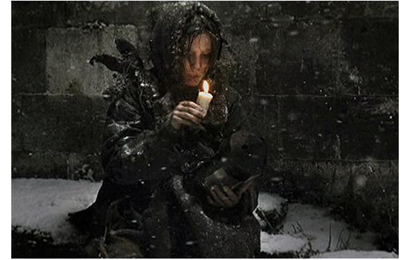 ジャクーは、町の雪道を足を引きずって歩いていた。凍傷気味なのだ。足が痛くて座り込む。たまたま、居合わせた2人組の少年乞食は、誰も恵んでくれないので、「何て冷淡な奴らなんだ。哀れんでもくれない」「ろうそくだって食べれるぜ」と言い、「なあ、寝る場所でも探しに行こうぜ」と誘ってくれる。しかし、「後で行くよ。疲れたんだ」と断る。もう限界だったのだ。頭の上の窓辺に置かれたランタンからロウソクを抜き取ると、試しに食べてみるが、少しかじってやめた。
