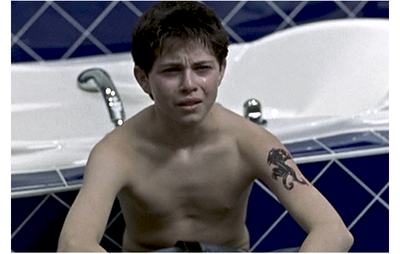 バーガーショップで朝食をとりながら、自宅の電話代の請求書と、昨夜の稼ぎとを比べて見ている。家計費のための小児売春なのだ。すると、窓を叩く音がする。知り合いの麻薬ディーラーの若者だ。「やるって?」。「ああ。練習台代わりだとよ」。これは、ネイサンが刺青を頼んでいたのだ。テーブルの上のお金を見て、「また、ケツの穴 売ったんか?」「お前のケツが、こんな金になるとはな」「200ドルもある」。さっと取り上げる若者。「僕のだ。 謝礼だから」とネイサン。「あいにくだな、ボーイ・スカウト。電話料の請求は待たせとけ」と言い、「200ドル、プラス、貸しだ」「かなりヤバいから、まず水で薄め、順に濃くしろ」とネイサンのママ用の強い麻薬を渡す。そして、そのまま、若者の先導で、刺青師の仕事場に向かう。「お前のママ、俺のこと まだ好きかな?」と訊かれ、「他のと、交換したいよ」。当然、本音だ。ネイサンを見た刺青師は、「ガキじゃないか」。自分で考えた刺青の絵を見せて、「絵みたいに してよ」と頼むネイサン。「悪くない。どっちの腕か決めたら、袖をまくれ」。施術が始まる。痛さに顔をしかめながら、「学校に、遅れちゃう」と焦るネイサン。「何年生?」と訊かれ、「8年(中学2年)」。「これで、女の子にモテモテだな」。若者がすかさず、「女の子は嫌いだよな、ネイサン?」と意地悪く突っ込む。「もちろん、好きさ」。