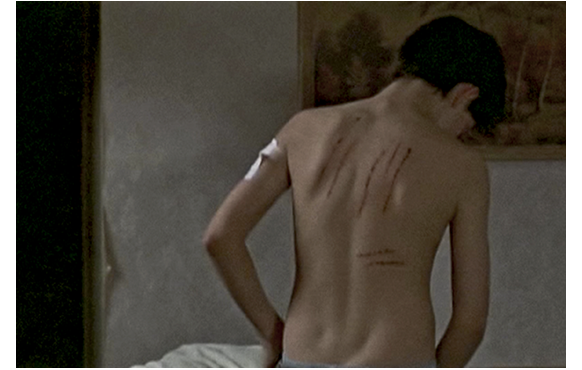 その日、学校では体育の授業があった。2組に分かれて試合をすることになり、シャツを着たまま組と上半身裸組とに分けられたが、その時ネイサンは運悪く後者に。背中にはベルトの跡があり、腕には刺青のガーゼとあっては、とても裸にはなれない。頑として脱がないので、生徒達ともめ殴られる。鼻血を出したまま教師に呼びつけられ、「どうした、ネイサン? 原因は、お前か、奴らか?」と訊かれ、肩をすくめる。「分かって やるから」にも、「どうかな」。「言ってみろ。一日でも待つぞ」。仕方なく、前向きに脱いで、「医者が、アレルギーの検査を」と弁解。ガーゼをめくった教師が、鼻で笑う。「誕生日なんです」とネイサン。「誕生日おめでとう」。「問題に?」。「シャツを着ろ」。話の分かる先生だ。背中は見られずに済んだ。