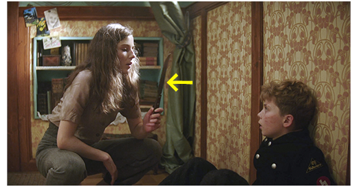 その結果、ジョジョは、台所にあったもので “武装” して、壁の前で身構える(1枚目の写真、矢印は包丁)。壁をノックして、「お邪魔します」と言うところが、可愛い。「お嬢さん? 壁の中のユダヤの女の子? ユフー〔Yoohoo〕、ユダヤ?」。返事がないので、「分かった。言うべきことを言いに来たんだ。僕は、君なんか怖くないし、君は、どこか他で住処を見つけるべきだ。OK?」と宣言する。すると、ジョジョの背後からいきなり現れた少女が、ジョジョ顔の真横で、「Not OK」と返事をする。ジョジョは、度肝を抜かれて悲鳴を上げ、少女に壁に叩きつけられ、落とした包丁を奪われる。少女は、包丁を手に取ると、「私の部屋から出ておいき」と脅し(2枚目の写真、矢印は包丁)、ジョジョは必死に這って出て行く。自分の部屋に戻ったジョジョに、アドルフは、「何て失礼な奴だ。ナイフを2つも奪いおって。どうやって、あいつを切り刻むつもりだ?」と叱咤する。「分かんない。何か考えてよ」(3枚目の写真)。アドルフは、考える中で、この映画の年代を確定する重要な言葉を口にする。「去年、一本腕の海賊フォン・シュタウフェンベルクの奴が、時限爆弾で私を吹き飛ばそうとしたのを覚えとるか?」〔フォン・シュタウフェンベルクは伯爵、参謀大佐。1944年7月20日に「ヴァルキューレ作戦」でヒトラーの暗殺を計画した中心人物(現在は、英雄視されている)。一本腕というのはオーバーで、爆撃による重傷で 右手を失った(左目、左手の薬指と小指も)/この暗殺未遂を “去年” と言っているので、映画の舞台は1945年1月(ドイツは、占領地と同盟国のほとんどを失っている。ヒトラーの自殺は4月30日)/ジョジョがケガをしてから半年経つがちっとも良くなっていないのは変/1月なのに広場には雪がなくて夏のよう〕。アドルフは、暗殺されかけた時、仲間をあぶり出そうと、自分が死んだと思わせたことを例にあげ、「奴を安心させろ。そうすれば、ガードを下げる。そしたら、逆に操ってやれ」と示唆する。「リバース・サイコロジーだね」〔ここでも、現代用語〕。