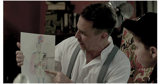 K大尉のいるヒトラーユーゲントの事務所は、敵襲に備えて騒がしくなっている。そこに顔を出したジョジョを見つけた大尉は、親しげに肩を組み、「どうした?」と訊く。ジョジョは、「ユダヤ人を通報したら、メダルでも もらえるの?」と訊く。「ユダヤか… 君はまだ奴らにこだわってるのか? 今は、差し迫った危機の準備に忙しいんだ」(1枚目の写真)。それでも、ジョジョは、「僕は、ユダヤ人についていっぱい学んだよ」と話し始める。「ユダヤ人が、お互い心を読めるって知ってた?」(2枚目の写真)「寝る時は、蝙蝠みたいに 天井からぶら下がるんだ」。「それは、魅力的だな。どこで、そんな情報を?」。「研究だよ。本を書いてるんだ」。「おめでとう。題名は?」。「『Yoohoo ユダヤ』。暴露本なんだ」〔Yahooをもじった?〕。それを聞いた大尉は笑い出す。そして、「君は、想像力が豊かだな」と褒める。「ホントだよ」。「もちろん、そうだろうとも。私も、君の年頃には、コニーという名の空想の友がいた」。そう言うと、大尉はジョジョを自分の机の横に座らせ、自分流にデザインし直した ど派手な軍服の絵を見せる(3枚目の写真)。