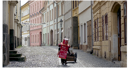 そのあと、ジョジョが送り出されたのが、戦争用に不足している金属の回収。ジョジョは、如何にもユーモラスかつ現代的なロボットの格好をして、なべ・かま類の回収をすべく、リヤカーを牽いて町を歩いている(1枚目の写真)。