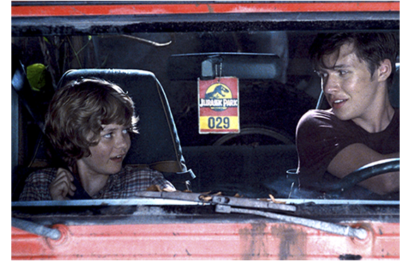 グレイとザックの兄弟は、滝でインドミナスをまくと、ジャングルへと入って行く。地面にころがっていた割れたヘルメットを怖そうに拾い上げるグレイ。近くには、壊れたジープもある。実は、これらの残骸は、インドミナスが逃げ出してから最初に行われた捕獲作戦の惨めな失敗の跡だった。その場所のすぐ先で、兄が、ジュラシック・パーク時代の旧ビジターセンターの入口を見つける。急いで中に逃げ込む2人。いつインドミナスに襲われるか分からないからだ。旧センターの中は廃墟と化している。内部を調べていると、20年前のジープを発見する。車の修理に詳しい兄は、使えそうなバッテリーを別の車から外す。どうせ動かないや、と諦め顔のグレイ(1枚目の写真)。兄に「そこら辺にいると思ってるのか?」と訊かれると恐怖のあまり声も出ない。「いいか、絶対この近くにはいない。いいな。安全なんだ」。以前と違い、兄には、弟を思いやる心が生まれている。そして、バッテリーを渡し、「さあ、これを持って行け。俺より強いだろ」。その信頼の言葉に、かすかな喜びを見せるグレイ。結局、古いバッテリーの再充電に成功。さっそくジープに乗り込む。グレイが、「運転免許試験に落ちたと思ってたけど」と兄に訊くと(2枚目の写真)、「路上試験だけだ」。グレイとザックは、もう気心の知れた仲の良い兄弟のように振舞っている。そして、ビジターセンターに向かって、ジープを急発進させる。