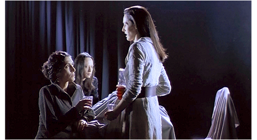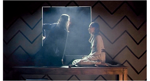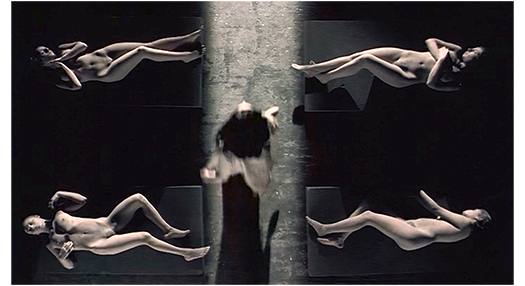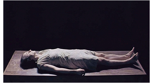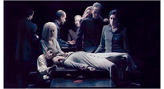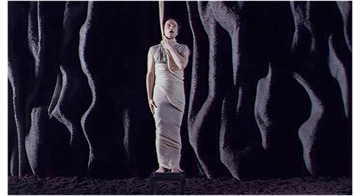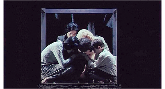 アンティゴネになりきった弟は、原作のアンティゴネと同じように首を吊るシーンを演じたくなる。そして、台の上に乗って布を首に巻きつけていく(1枚目の写真)。足の下の台が、どういう経緯で外れたのかは明らかにされない。次のシーンでは、首を吊って本当に死んでしまった弟の脚を、姉と妹が両側から支えるシーンとなる。盗人がイスに登って布を外し、3人で遺体を運び、台の上に安置する(2枚目の写真)。すると画面は暗転し、「私は死んで、想像もしなかった世界にいる自分を見出した。私は死んで、親交を得た。恐るべき真実だ」という弟の言葉が入る。