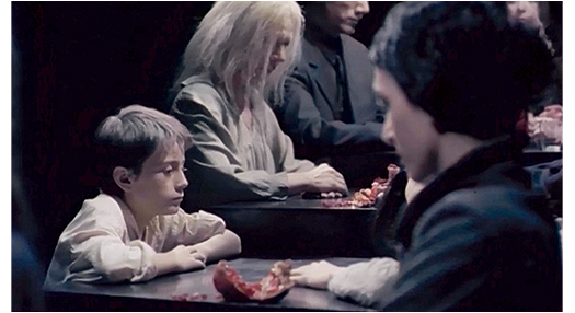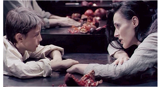 この映画の中で、「焼死させられた」息子の2年後の姿を演じている10歳くらいの少年がいる。それが誰なのか確定できない。映画のエンドクレジットには4人の男性の名が、役名なしで1人、もしくは、2人ずつ表示される。一番最初に示されるのは「弟」を演じる男優。その後、3人の女優の名前が1人ずつ紹介される。順番は、不明だが、姉、妹、盗人の何れかであろう〔盗人は男優かもしれない〕。その先は、2名連記となる。最初の2名の下側がFilippos Intzes、最後の2名の上側がSotiris Dimitriou、下側がHaris Angelou。IMDbのCastは、エンドクレジットとは無関係に並んでいるので、参考にならない〔1番上がHaris Angelouになっていて、主役が13番目になっている/よくあるように、出演順ですらない〕。この3人のうち、1回しか映画に出ていないのは、Filippos Intzes とHaris Angelouの2人。このうちどちらだろう? 一番台詞の少ない子役は最後と考え、ギリシャ語のサイトを探したら、Χάρης Αγγέλου(Haris Angelou)は、2004年に「王子と乞食」の劇に出演したとあった。従って、子役のリストにはHaris Angelouの名前で登録した。彼の出番は、第1部は1回のみの短いシーン。第2部は最も長く3回。1回目は50秒だが台詞が一番多い。3回目は3分20秒続く全裸シーンだが母と子の愛の深さを表現したもの。第3部も3回。2回目は約5分続く集団シーンの中で、短いが台詞もある。3回目は、映画の最後を飾る印象的なシーン。