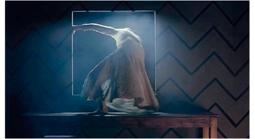 続いて、盲目の女性が葬儀用の花飾りを作っている〔この女性が誰なのか、最後まで分からない。一家は姉弟妹の3人なので、親戚か、親友か?〕。背後は一面のロウソク。そこに登場する1人の男性。この映画の一番の主役となる「女流彫刻家の弟」だ。第1部では、彼が死んだことのみが示される。自分の棺の前に出現し、その姿が次第に消えていくことで「死」を表現している(1枚目の写真)。次に、弟が盗人にタロット占いを受ける場面がある〔第1部ではタロット、第2部ではサイコロ、第3部ではチェス〕。3枚のカードの中央は「骸骨」なので、死を現している。ここまでが、弟。次の場面では、姉が壁に寄りかかって嘆き、その奥の立方体の枠の中には、右に、死んだ母を背負った弟がいる。そして左には、妹が2年前に自らの過失で焼死させた息子を抱いている(2枚目の写真)〔Harisが初めて登場するシーン〕。弟と妹は額を合わせる。悲しみの共有か? 盗人が、「アベマリア」と彫られた文字を指す(3枚目の写真)。
