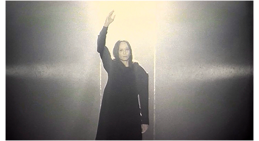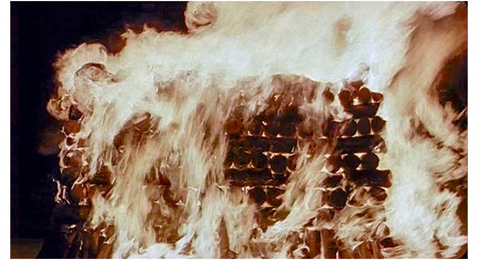 そして、第1部でもあった、ガラスの器が並ぶ棚の前でのシーン。妹は、テーブルに置かれたガラスのコップに顔をつけ、苦しみのあまり呻き声をあげながら、コップを次々に床に落とし(1枚目の写真)、テーブルの上に乗り、仰向けになって前を見つめる。その前に、息子が立っている(2枚目の写真)。彼は、「ママ、見えないの? 僕、燃えてるよ」と落ち着いた声で言う(2枚目の写真)。妹は、欲情の床から飛び起きると(3枚目の写真)、炎に包まれた息子のベッドを見て絶叫する(4枚目の写真)。最後の2枚は、以前の映像とほぼ同じものだ。1つの事故が、視点を変えて語られる。