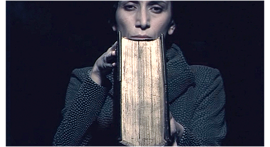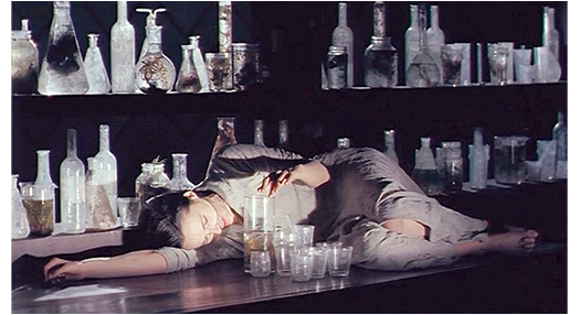 妹が腹部を押えながら台の上で苦しむ。背景にはガラスの器が並ぶ棚がある(1枚目の写真、このシーンは 各部ごとに3回現れる)。すると、母の記憶は蘇り、男と欲情のベッドに入っていて飛び起きると、息子の寝ていたベッドは炎に包まれていた。妹は絶叫する(2枚目の写真)〔ここで 2年前に焼死したのがHarisの演じる少年〕。姉は、開いていた本を閉じ、「汝、殺すなかれ」と言う(3枚面の写真)〔当然、妹の行動を強く批判した〕。映画が始まって7分。ようやく2つ目の台詞だ。しかし、この「汝、殺すなかれ」は、次のシーンにも関連している。首を吊って死んだ兄の体を、姉と妹が支え、盗人が布を外して死体を下ろす。