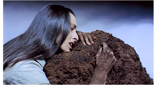 ここから、第2部。「サイコロ」、より内容にそぐえば、「偶然」。具体的に何が起こったかが映像化される。そして、そこには偶然が作用していたことが分かる。最初に映るのが、妹の欲情シーン。この母は、息子を放っておいて男と性欲にふけっている(1枚目の写真)。すると、男は立ち去り、1人になった妹の背後に1人の少年が現れる。少年は、母の顔から肩にかけて愛しげに触る。そして、首筋にキスをする(2枚目の写真)。妹は、「あなたは誰?」と訊く。「大きくなったあなたの子供」。「声が違うわ」。「辛い〔焼け焦げたことに〕耐えたから」。「痛いの?」。「時が癒してくれた」。「濡れてるわ。寒いの?」。「海を越えてきたから」。「なぜ、戻って来なかったの?」。「死んじゃったから!」。そして、去って行く。これは現実の世界で母が見た夢だったのだろうか? 妹はベッドから起きると、涙を流し、自分の過ちを思い出し、もがき苦しむ。その直後のシーンは、妹の後悔の念を映像化したもの。妹は、土くれの山にすがるように抱きつくと、「坊や、許してくれなくていいのよ」と声をかける(3枚目の写真)。「私の魂は永遠に救われない。でも、あの時、私があんなことをしていなければ、あなたは救われていたかもしれない。私が、あなたに、歌ってあげたり、お話をしてあげたりしていたら… でも、もう遅すぎる」。そして、亡くなった息子への永遠の愛と、情欲には二度と走らないことを誓う。次は、弟が盗人とサイコロで勝負する場面。負ける。第2部の題名の「サイコロ」が直接関連するのはこの短いシーンのみ。