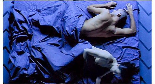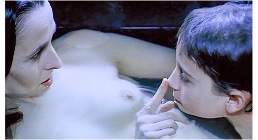 妹は、意味のない言葉を お経のように呟き始める。「黒、水、黒い水、水は黒い、黒い黒い水」。そこに「母と子」が入って行く(1枚目の写真)。2人は正座し、向かい合い、手を取り合う。「何も言えない、言わない何も。何も見ない、見ない何も」。2人はお互いに足を開いていく(2枚目の写真)。「知っている。奇跡なんかない、棚ぼたなどない。奇跡も棚ぼたもない」。2人は体を密着して向かい合う(3枚目の写真)。「責め苦。残酷」。母は顔を水につけ、しばらく潜っていて、再び出すと首を振る(4枚目の写真)。「言葉がない、何と言おう。水が見えない、水を通して見えない。濡れて溺れる、溺れない、もう溺れてる、あなたは溺れてる、溺れてない」。2人はぐるぐると回転を始める。「あなたは燃えている、水の中の火、水の中の煙。燃えている、火、煙」(5枚目の写真)。「私の子供は水を見ない、記憶がない。私は目撃した」「川、泳ぐ、川であなたは泳ぐ」「私は人生の刺激、あなたは人生の刺激」「これは別の人生。違う、これが人生」「行かないで。どこに行くの? 連れて行って。どこに行くの?」。2人は激しく絡み合う(6枚目の写真)。そして、再び2人は抱き合う。「寒い? 私は寒い、寒さで震える」。母は子を抱きしめる。「もう息ができない。冷たさが私を圧倒する」。このシーンは、大人と子供ではあるが、女性と男性が全裸で絡み合う。しかし、そこには母の子に対する切ない愛が溢れていて、異常な感じはしない〔撮影や、演技は大変だったと思うが…〕。