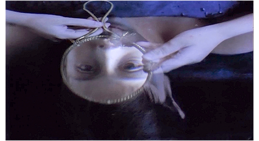 妹と盗人の話。そこで、盗人は、弟が首吊りの真似をしようとしているうちに、足を乗せていた台が動いてしまい、助けようとしたが間に合わなかったと話す。「あなたは誰?」。「盗人」。そして、第1部でもあった「首を吊って死んだ兄の体を、姉と妹が支え、盗人が布を外して死体を下ろす」シーンのくり返し。その後、弟の遺体を前に、3人が座っている時、姉がいきなり「マタイによる福音書」の第25章14.15と28-30を唱える。唱える内容は、映画とも乖離しているので、趣旨が分からない。その直後、妹は、「私は、2年前 息子を亡くした。あの子の小さなベッドが炎に包まれた」と言い出す(1枚目の写真)。それを聞いた盗人は、「私は何も言わない。私には、馬の魂、猫の眼、狐の心臓があったから盗人になった」「盗人になるには芸術家にならないといけない」と自慢する。そして、兄にも盗人の心があれば、「首を絞めてしまうことになる」と気付いたはずだと指摘し、妹の反撥を買う。妹は、2年前の夜に大きなものを失い、以来取り戻せていないからだ(2枚目の写真)。妹の想念の中で、息子が水の中から蘇る(3枚目の写真)〔燃え死んだ息子は 水の中にいるのが好き〕。