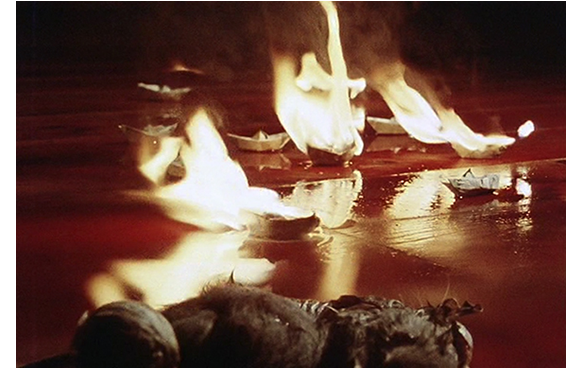 「できる早く ここを出ないと」とイシドール。「海賊の島へ?」と少年。ガラスを伝って流れ落ちる血を見ながら、「見て、流れてる」。そして、「紙、持ってる?」と訊く。床に出来た血だまりに、紙幣を折って作った紙の舟を浮かべ、火を点ける少年。「お札が血に触れると、輝くんだ、すぐに」。シュールレアリズムそのものだ。