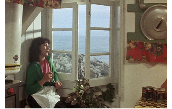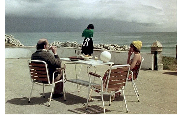 映画は、2人の夫婦と、妻とさほど年の違わない“養女”のイシドールが、海岸の家で過ごしている場面から始まる。このシーンは現実だと思われる。窓辺に座り、「愛は決して遮られない。あなたとは別れたくない。あなたと私は一心同体。あなたの香りが広がる。死者のミサ中の蝋燭のように、墓場の風のように」と口ずさむイシドール。何かというと独り言を口ずさむのが彼女の癖なのだ。この部分は、かつてのフィアンセに向けられた言葉だと後から分かる。海に面したテラスでは、テーブルの上に白い球が。夫の指示に従って“従順”に撥ねる。この球は、修道院から従順についてきたイシドールを象徴しているのかもしれない(違うかも)。
