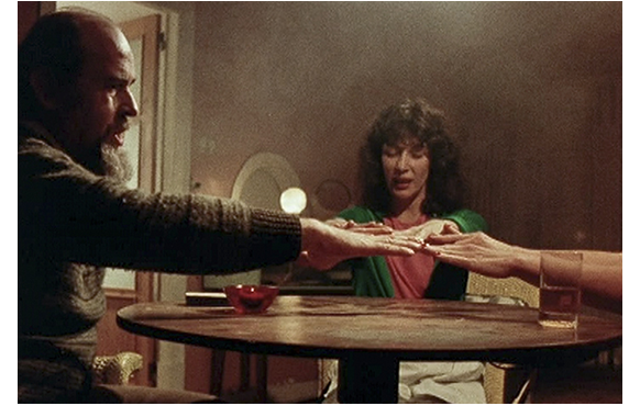2人は、沖合いの島へボートで向かう。ここから映像が赤っぽく変わる(あまり赤くて見づらいので、下の写真では赤のトーンを下げている)。ここから43分続く島のシーンは、すべてイシドールの意識の中で起こったできごとで、現実ではない。冒頭は、2人が岸辺に着いた場面。少年の様子が変なので、イシドールが「どうしたの?」と訊く。「別に」。「別にって?」。「どうやって、厄介払いしようかと」。「こんなに尽くしたのに、捨てる気なの? 理由くらい聞かせてよ。フィアンセなんでしょ?」。「僕の家族は、あんたが嫌いだ。だから、結婚しちゃいけないって」。「家族?」。「全員 殺したくせに」。「そう思う? 覚えてないよ」。「あんた、誰?」。「当てて」と不思議な笑い方をすると、少年はさっと消えて行った。つまり、これから、イシドールが島で体験することは、すべて少年によってコントロールされた“意識改造の儀式”としての幻影なのだ。