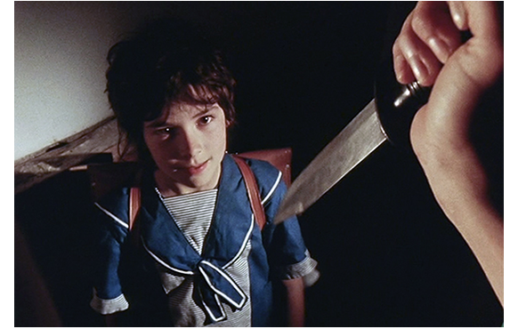 ここで、少年がイシドールの包丁を目にかざす。「これ、君のナイフ。きれいだね」。「気持ち分かるわ。人間って醜いの」。「真っ赤?」。「醜くて、過激」(“rouge”には赤いと、過激の意味がある。イシドールには、少年が「赤」と言った意味が分からない)。そして、部屋で寝ている養父を指して、「死んだみたいに 眠ってる。でも、中は血でいっぱい」と言う。少年は「血で? 違う。ただの水袋だよ」。そして、「ナイフで遊んでいい?」と訊く。止めるイシドールの頬にキスすると、養父に近付き、左の頚動脈を切る。「やったの?」。「どう思う?」。抱き合って喜ぶ2人。