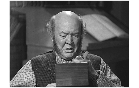 そして、乾物屋。セドリックは、先端に熊を彫ったパイプをプレゼントする〔原作にはない〕。その後で、「これが ほんとのプレゼントだよ、ホッブスさん」と渡したのが鎖の付いた金の懐中時計。「そこに何か描いてあるでしょ。蓋の裏に。僕が頼んだんだ。読んでみて」。ホッブスは、時計を手に取ると、読み上げる。「最も古い友人、フォントルロイ卿からホッブス氏へ。これを見たる折は、私を思い出されんことを」(1枚目の写真)。「僕を 忘れて欲しくないの」。「忘れるもんか。お前さんこそ、イギリス貴族の中に入っちまって、俺のことを忘れるなよ」。「どこに行っても、おじさんのことは忘れない。会いに来て欲しいな。きっと、お祖父様が手紙で招待するよ。お祖父様が伯爵でも気にしないよね?」(2枚目の写真)。「会いに行くとも」。そして、しっかりと握手する。なぜホッブスからの餞別がないのか〔原作でも〕、よく分からない。
