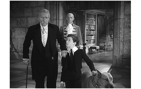 翌日、セドリックと弁護士を乗せた馬車は城に向かう(1枚目の写真、城は、このようにマットペイントでしか表現されない)。この映画で不思議なのは、御者の横に座っている召使が常に腕を組んでいること。こんな姿を見たことがないので、一体何なんだろうと思ってしまう。城の正面玄関に着いた馬車。ここだけはセットだ(2枚目の写真)。