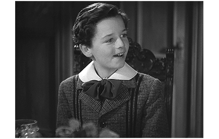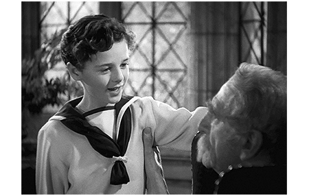 弁護士は、出迎えた執事のパーヴィスを紹介し、セドリックは、執事にも握手を申し出る(3枚目の写真、背景の木は幕に描かれた絵)。パーヴィスはその奇妙な態度を不審に思うより、感激したに違いない〔原作には、執事は登場しない〕。「初めまして」。「ありがとうございます、閣下」。扉の両脇には召使が立っているが、そちらに挨拶はしない。中には4人の女性が並んで待っている。先頭が女中頭のメロン夫人〔これは原作と同じ〕。ここでも握手する。メロン夫人は、歴代の映画の中でも最も上品で優しさの塊のような女性(2枚目の写真)。セドリックが2人目に手を差し出すと、女中の分際(ぶんざい)では叱られると思ってか、腰を下げて挨拶する。
