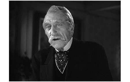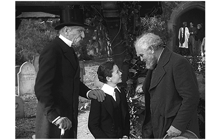 ミサが終わり、教会から出てくるセドリックを ヒギンズが待っている。伯爵:「やあ、ヒギンズ」。セドリック:「あなたが、ヒギンズさんですか?」と微笑みかける(1枚目の写真)〔さすがに握手はしない〕。「新しい領主を見に来たのであろう」。「はい、閣下。若様がご親切に庇ってくださったものですから、お礼を申し上げようと思いまして」。そう伯爵に説明すると、ヒギンズはセドリックに丁寧にお礼を述べる。しかし、セドリックは、「僕は手紙を書いただけで、なさったのは お祖父様です」と訂正する(2枚目の写真)。「お祖父様は、いつも皆さんにいいことをなさるでしょ」。ヒギンズは、その言葉に戸惑いながら、お陰で妻も回復したと述べる。セドリックは、「お子さん方が猩紅熱だと聞いて、お祖父様も心配しておられました」と実際にはなかったことを付け加え、ヒギンズだけでなく伯爵をもドギマギさせる。「どうだ、ヒギンズ、お前たちはわしを誤解してきたようだな。フォントルロイ卿はわしをよく分かっておる。わしの人柄について確かなことが知りたくば、卿に訊くがよい」。伯爵の言葉は原作とほぼ同じだが、その時の表情が、原作に書かれた「苦々しい笑み〔fine grim smile〕」とは言い難い。