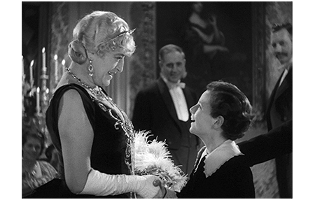 原作の削除が目立ち、場面は一気に城で開かれた「フォントルロイ卿のお披露目パーティ」へ。セドリックは、真っ先に、伯爵の妹 ロリデイル夫人に引き合わされ、夫人はセドリックの虜になる(1枚目の写真)〔原作によれば、夫人が城に招待されたのは、35年前の結婚以来、僅か2度目〕。夫人がセドリックの父を好きだったこともあり、2人の会話は弾む。セドリックの話が、父から母に移ると、伯爵はすかさず、夫人の夫君〔ただの「サー」なので、かなり格下〕への紹介に切り替える〔原作にはない〕。妹と2人だけになった伯爵は、「コンスタンシア、打ち明けるが、そなたも見抜いておるだろうが、わしは、親バカの年寄になりかかっとる」と打ち明ける(2枚目の写真)。それに対し、夫人は、伯爵がセドリックの母親を無視しているのを批判する〔原作では、母に会いに行くが、映画では、この問題に、それほどまでには執着しない〕。伯爵が次にセドリックを引き合せたのは、ロンドンの社交界の華 ミス・ハーバート。彼女に、「おっしゃいな、フォントルロイ卿、なぜ そんなに私を見ているの?」と訊かれたセドリックは、「何て美しい方なんだろうと思ったんです」と答える。それを聞いた年輩の貴族が、「フォントルロイ、存分に楽しむがいい。大人になったら、そんなことを言う勇気はなくなるぞ」と笑いながら言う。セドリックは、「誰にも、言わずにはいられないでしょ〔Nobody could help saying〕。この方、美しいと思われないのですか?」と反論する(3枚目の写真)。「我々は、思ったことを口にしちゃいけないんだ」。原作通りだが、セドリックの初々しさがよく出ている。