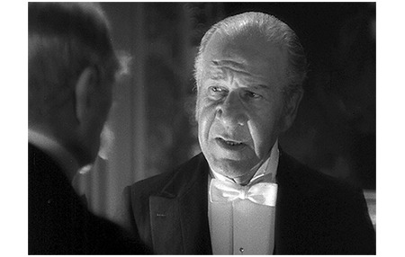 パーティの途中、緊急の用事で現れたハヴィシャム弁護士は、パーティが終わると、直ちに伯爵に暗いニュースを伝える。「悪い知らせでございます。最悪ではないかと、閣下」。そして、「もし、これを真に受けるなら、ここに寝ておられるのは、フォントルロイ卿ではございません。ただの エロル大尉のご子息です」(1枚目の写真)〔セドリックは疲れてソファで寝ている〕。ロンドンの弁護士事務所に、長男ベーヴィスの子供だと称する少年を連れた極めて野卑なアメリカ女性が現れたのだ。伯爵は、「何だと! 気が狂ったか! 嘘だ! 忌まわしい嘘だ!」と激昂する。弁護士は、女性の話として、ベーヴィスと11年前にロンドンで結婚したと話す〔原作では「6年前」になっている。なぜ5年も前にしたかは、女の連れて来るみっともない少年が、セドリックより年上のため/子供は、デーヴィスが女を捨ててからアメリカで生まれた〕。証拠は結婚証明書と子供の出生証明書〔出生証明書はアメリカで発行されたものなので、偽造品でも見分けがつかないはずだが、それに関する調査は行っていない→極めて重要な件なのに、脇が甘い〕。弁護士から女性の無教養ぶりを聞かされた伯爵は、「わしは、最後まで異議を唱えるぞ! ベーヴィスの子供など認めん!」と怒鳴る(2枚目の写真)。しかしそのあと、伯爵は、自分がセドリックの母を如何にないがしろにしてきたか後悔し、「天罰〔retribution〕かもしれん」と口にし、寝ているセドリックの顔を見ながら、「わしが、子供に愛着を感じるようになると言う奴がいても、信じなかったろう。だが、わしは この子が可愛い。おかしなことに、この子も わしを好いておる」(3枚目の写真)と心のうちを打ち明ける。