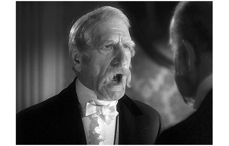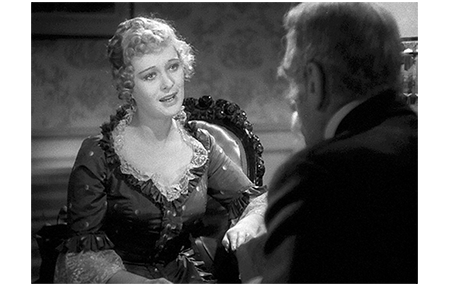 「爵位請求者」が村の宿屋に入ったと知ると、城には一歩も入れなかった伯爵は、弁護士を伴って部屋を訪れる(1枚目の写真)。女は、最初だけ愛想よく、「会えて嬉しいわ、そうよね、閣下さん」と言うが、伯爵が苦虫を潰した顔のまま無言でいると、13歳は下らない不細工な子を呼び寄せ、「ほら、お祖父ちゃんに握手して」と押し出す。その不出来の息子は、左手にキャンディーを持ったまま、伯爵の前に行くと、キャンディーを口にくわえる(2枚目の写真)。あまりの下品ぶりに、伯爵の蔑みの表情が増す。息子も相手にされないと知った女は、急に態度を変え、「ナンなのさ、そんな冷たい目で見て、あんたの孫なんだよ!」と文句を言う。詐欺の片棒をかついだ悪徳弁護士もしゃしゃり出て来て挨拶するが、伯爵は彼も無視する。その後、女は伯爵に向かって言いたい放題わめきちらす。その表情は、如何にも蓮っ葉な売女といった感じ(3枚目の写真)。原作には、「伯爵は、女に好きなだけ話させ、要求させ、女が疲れるまで、一言も口をはさまずにいた」と書かれているだけなので、この長時間にわたる女の罵詈雑言はすべて創作。黙っていた伯爵が最後に言う言葉は、ほぼ原作通りだが… 「お前は、わしの長男と結婚したと言っておる。万一、それが証明されたら、法はお前の味方だ。その時は、お前の息子がフォントルロイ卿になるだろう。ただし、徹底的に調査するから覚悟しておけ。お前の主張が証明されたら、お前にくれてやる。だが、お前と、その息子には、わしが生きとる限り二度と会うつもりはない。わしが死んだら、残念だが、お前の好きにするがいい」。青字(原作)の部分が抜けているので、文脈が全く通らない。
