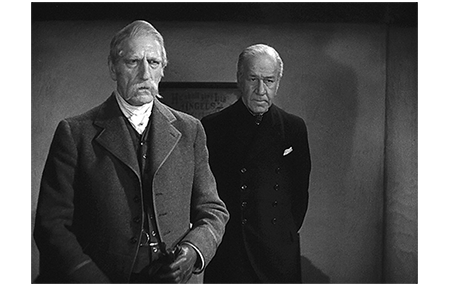村の宿屋では、隔離状態に置かれた詐欺女はイライラが募っている。詐欺弁護士はロンドンに行くよう勧めるが、詐欺女としては、それだと伯爵を喜ばせるだけなので、したくない。「この、しけた田舎のパブに居座ってやる」。「もっとひどい場所に住んでたじゃないか」。「関係ないだろ。そんな口きいてると〔keep a civil tongue〕、クビにしてやるからね」。「私ならしないな」。「どういう意味さ?」。「言った通りだ。私なら、そんなことはしないな、ミナ」〔ちゃんと名前を知っている〕。「あたいは、レディ・フォントルロイだよ」。弁護士はバカにしたように笑う(1枚目の写真)。そこに、突然、伯爵が入って来る。ミナが喜んだのも束の間、次に、ディックが入って来て、「やあ、ミナ」と声をかける。さらに、ベン、ホッブス、ハヴィシャムの順に入って来る。ハヴィシャムは、ベンに、「この女を知っているかね?」と尋ねる。ベンは頷く。そして、「子供はどこだ?」とミナに訊く。ミナは、生まれて3日で肺炎で死んだと嘘をつくが、ディックがこっそり奥のドアを開けると、そこにいた少年が、「やあ、ディック叔父さん」と恥ずかしそうに言う。企みがバレても、ミナは、「汚いスパイ野郎! あたいをハメたね! 覚悟しな、法律に…」と喚くが、誰も相手にしない(2枚目の写真)。詐欺弁護士は、「私は何も存じません、閣下、誓います」と責任逃れに必死。ハヴィシャムに「出生証明書の偽造問題がある」と指摘されても、「誓います!」としらばくれる。細々(こまごま)したことなど どうでもいい伯爵は、「とっとと、この国から出て行け!」と一喝して、すべてを終わりにさせる。