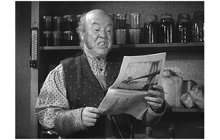 セドリックは、「ホッブスの極上の野菜と乾物」と書かれた店に入って行く。ホッブスは、ささやかな誕生会を用意している。飲物はジンジャーエール1本、食べ物はクッキーとキャンディーだけ。セドリックはディックが来るまで待って欲しいと頼む〔原作では、ホッブスとディックは、セドリックがブルックリンにいる間は、まだ赤の他人〕。そして、この後が原作と同じになる。待つ間、ホッブスが新聞を見ている。「何読んでるの、ホッブスさん?」。ホッブスは、「Harper's Weekly」という新聞〔1857~1916年の間 ニューヨークで発刊された政治雑誌〕の一面に載った「大勢の貴族たちが小冠をかぶっている絵」を見て、「小冠をかぶった伯爵やら侯爵らが、自分たちが一番偉いみたいにのさばってやがるのが、我慢ならんのさ」と言う。セドリックは、「伯爵や侯爵にたくさん知り合いがいるの?」と訊く。「まさか。この店に、こいつらの中から1人連れて来たいもんだな。そしたら、その がめつい暴君野郎には、クラッカーの樽にだって座らせてやらんぞ」(1枚目の写真)。「この人たち、もう少し知ってたら、伯爵にはならなかったかもね」(2枚目の写真)。「とんでもない! 名誉に思ってるのさ。それが奴らなんだ。悪党どもだぞ」。ここで、ディックがやって来る。3人で乾杯したところに、エロル家の保母兼女中のメアリーがセドリックを呼びに来る。