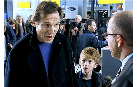 2人が学校の玄関から出ると、ジョアンナが車に乗るところ。手間取っていて、遅くなってしまったのだ。がっかりするサム。ダニエルは、「大丈夫。空港に行こう。近道を知ってる」と、追いかける。ここから、映画は、サムがジョアンナに会おうとする話と、コリン・ファース演じるジェイミーがポルトガルに住む女性に求婚に行く話だけを、織り交ぜながら編集し、エンディングに向かって「愛することの素晴らしさ」を盛り上げていく。そういう意味では、サムとジェイミーが映画の最後を締める主役になっている。ダニエルとサムはヒースロー空港に到着。しかし、近道を通った割には追いつけず、ニューヨーク行きの21時45分の便は最終搭乗の案内中。出発ゲートに行き、ダニエルが、「搭乗する訳じゃないんだが」と話しかると、「搭乗券がなければ入れません」と断られる。「息子が、人生で最も大切な愛する人にさよならを言うのでも?」(1枚目の写真)。「だめです」。次に現れた客がRowan Atkinson。搭乗券が見つからなくて探している間に、その背後では、ダニエルが、「走って逃げられるか?」とサムに訊く。「やっていいの?」(2枚目の写真)。「ああ」。「じゃあ行く」。サムは、係員がRowan Atkinsonに気を取られている隙に、ゲートの中に駆け込む。