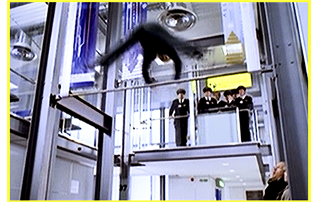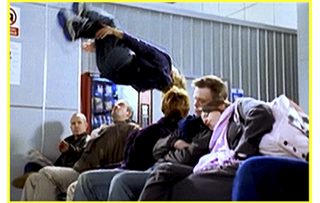 そこからは、サムの一人舞台。保安検査場では、金属探知機のゲートの前でジャンプして、うずくまって靴を調べている係員の頭上を飛び越える(1枚目の写真)。deleted sceneでは、冒頭、監督が、当初の脚本ではサムが素晴らしい体操の選手だという設定になっていて、空港内でジョアンナを追いかけるシーンでもその能力を発揮することになっていたと解説する。しかし、結局は普通の少年にしたため、関連する3ヶ所は削除された。その最初が、ゲートでのジャンプ・シーン。単に飛び越えるのではなく、空中で前方1回転して着地する。免税店街を駆け抜けると、その先の待合室では多くの乗客がイスに座っている。その間をサムは、連続側転し、途中から後方宙返りに変える(2枚目の写真、deleted sceneなので黄枠)。その後は、36番ゲートに向かって通路を走り、非常口を逆行して搭乗口を見下ろせる場所まで辿り着く。そこからは、ジョアンナが搭乗口前のゲートに並んでいるのが見える。サムは叫ぶが、ガラスで遮蔽されていて聞こえない。映画では、そこからどうやって搭乗口まで降りて行ったかが不明だが、deleted sceneでは、それを派手にやってのける。係員に追い詰められたサムが、開口部から鉄の棒に飛び移り、そこで1回転してから、もう1本下の棒に飛び移り(3枚目の写真、deleted sceneなので黄枠)、そこでひねって向きを変え、空中で後方1回転して着地する。まるで体操の段違い平行棒の演技を見ているようで、映画の流れの中で違和感の方が大きい。削除したのは当然だと思うが、面白いので復活させた。搭乗口の脇に着いたサムは、中の様子を覗う(4枚目の写真)。客は誰もいなくて航空会社の職員2人と空港係員が行く手を阻んでいる。ちょうどその時、TVのモニターが、ビリーを映している。今年のクリスマスのNo.1ソングに選ばれたのだ。そして、ビリーは、No.1になったら、イヴに日に全裸で演奏するとインタビューでうっかり約束してしまっていた。3人は、どうなるかと笑いながら見ている。サムは、その隙をとらえ、柵を軽々と跳び越して(5枚目の写真)搭乗口に向かう。そこにはジョアンナがいた。