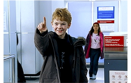 サムは、「ジョアンナ」と声をかける。振り向いたジョアンナは、「サム?」と言って寄ってくる。「名前、知らないかと思ってた」(1枚目の写真)。「もちろん知ってるわ」。その時、追いかけてきた警備員がやってくる。サムは、警備員に連行され、小さな子供なのでお咎めなしで出発ゲートまで戻される。サムが、ダニエルに「やった」とばかりに、前にやったように指を立てて喜びを伝えていると、後ろからジョアンナがやってくる(2枚目の写真)。肩をつついたジョアンナは、振り向いたサムに微笑みかけ、頬に軽くキスをする(3枚目の写真)。彼女は、飛行機が待っているのですぐに戻ったが、サムは大喜びでダニエルに抱きつき、ケイトとレオのように腕を拡げて感動を露にする(4枚目の写真)。