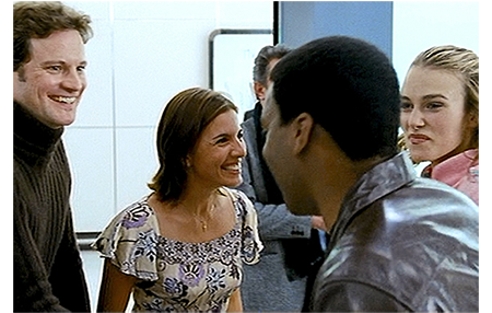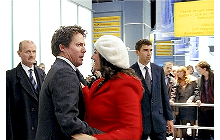 1ヶ月後。場所は再びヒースロー。映画の出場者の面々が次々と姿を見せる。その中には、ポルトガルで結婚式をあげ、イギリスで暮らすために戻って来たジェイミー夫妻、そして、そこで偶然会った、友人のKeira KnightleyとChiwetel Ejioforのペアもいる(1枚目の写真)。また、一度はAlan Rickmanの浮気で危機に陥ったEmma Thompson とその子供たちの一家もいる(2枚目の写真、矢印はEmma)。そして、映画の中での順序は逆転するが、首相と秘書の2人も(3枚目の写真)。