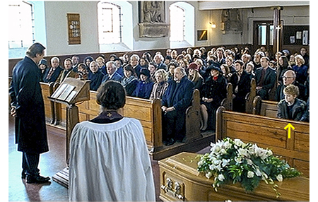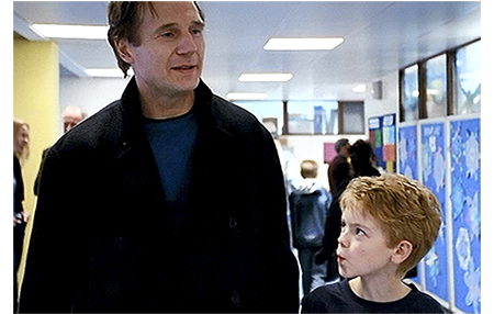 ダニエル=サム組の最初の場面。サムの義父ダニエル(Liam Neeson)が頭を抱えて悩んでいる。そして、電話をかける。「カレン、また私だ。申し訳ない。他に相談する相手が誰もいないんだ」。相手(Emma Thompson)は、「構わないわ。辛い時期ですものね。でも、かけ直していい?」と謝る。「もちろん」。「誤解しないでね。奥様が亡くなられたばかりのあなたのことは すごく心配してるの」。「ありがとう」。2つ目は ダニエルの妻の葬儀の場面。会衆者の前に登壇したダニエルは、「ジョーと私は、長い間、この瞬間に備えてきました」とスピーチを始める(1枚目の写真、矢印はサム)。このことから、妻は、突然の事故死ではなく、闘病生活の末の病死であったことが分かる。「彼女は幾つかリクエストを出し、中には、葬儀にはデートの相手としてクラウディア・シファーを連れてくるべきだというのがありました。これは、妻も 無視されるものと期待していたでしょう」と笑わせる〔Claudia Schifferは、この映画を最後に結婚・引退した女優。この映画ではキャロル役で登場し、映画の最後でダニエルと仲の良い関係になる〕。しかし、他のリクエストについては、その通りになると確信していました。彼女が、この先どうなるか、最初に打ち明けた時、私は、『そんなことは絶対させない』と申しましたが、彼女は、『ダニエル、覚悟はできている』と言いました。いつものように、私の愛しき女性… サムの優しいママは、正しかったのです」(2枚目の写真)。その後は、妻の希望に沿って、Bay City Rollersの曲が流され、ダニエルらによって棺が担がれていく。