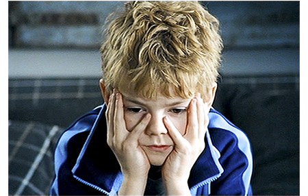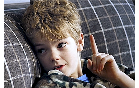 恐らく数日後、ダニエルがパソコンの前に座り、亡くなった妻の写真を見ていると、サムが元気なく近付いて来る。「どうした、サム、眠れないのか?」。「今日、最悪のうわさを聞いちゃった。ジョアンナがアメリカに帰っちゃう」。「君の彼女はアメリカ人?」。「そうだよ。それに、僕の彼女じゃない。アメリカに行っちゃうなんて、僕の人生終わりだよ」(1枚目の写真)。「困ったな…」と迷ったダニエルは、「ケイトが要るな。レオも要る。2人ともだ」と言うと、「おいで」と言ってTVの前に連れて行き、『タイタニック』の有名なシーン、船の先端でレオナルド・ディカプリオがケイト・ブランシェットに、「目を閉じて。僕を信じる?」と言い、ケイトが「信じるわ」と応じる場面を見せる。それを見ながら、ダニエルとサムも同じように手を拡げる。「私を信じる?」。「信じるよ」(2枚目の写真)。ソファに横になったダニエルは、「いいかい、サミー、彼女が特別で並外れた子なのは確かだが、世の中良く出来てて〔general wisdom is that in the end〕、1人の男性に1人の女性って訳じゃないんだ」と慰める(3枚目の写真)。「ケイトとレオはどうなの? そっちだって、ママだけだろ? 僕だってそうさ。彼女1人だけ」。そう言って人差し指を立てる(4枚目の写真)。