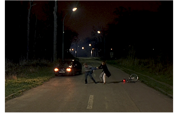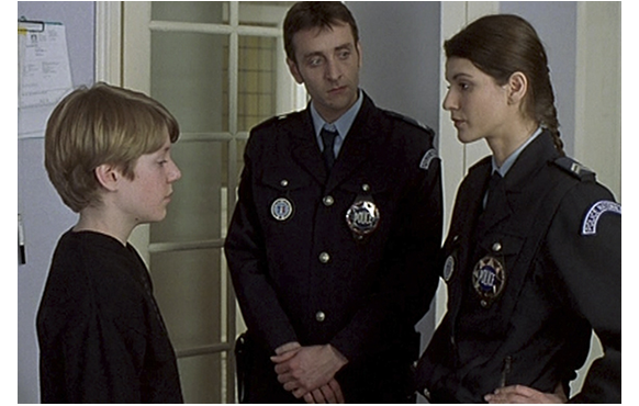 爆発前の最後のサイン。ジュリアンが、警察に「自殺する」と電話をかけた。こういう事態に慣れた女子警官が、母に「息子さんが、あなたに叩かれた」と言ったと問うと、母は、「叩かれた? 確かに、叩きました。少し」。「どう叩いたのです?」。「母親が普通、息子を叱るように」「確かにイライラしてました。疲れていたので」。一方、無責任な父は、「妻の言う通りです。大した事はありません」。しかし、ジュリアンも、女子警官の真剣な質問に対し、「そんな深刻じゃ… そんなに痛くも…」とはっきりしない。「“そんなに”って? 少し? かなり?」。「少し。ちょっぴり」。要は、これは、「これ以上、僕に構わないで」という母に対する警告なのだ。