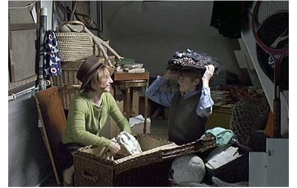 小さな朝食テーブルを4人で囲む幸せそうな4人家族のシーンから映画は始まる。そして、その直後、母と息子ジュリアンが客間の家具を仲良く動かし、そこでダンスをする。その間、ずっと歌が流れる。「♪君を迎えに来た。僕を待ってると 分かってたよ。僕たちは、互いに相手なしで済ませられないと、分かってたよ」(2回目のダンス・シーンの歌詞と比べると面白い)。その後で、屋根裏で古い衣装箱を出し、母と息子で帽子を被り合うシーンもある。如何にも仲がいい。