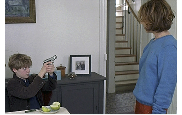 その警告は全く効かなかった。翌日ジュリアンは帰宅すると、いつものように髪を直しもせず、服も乱れたまま(母への反旗)、キッチンに置いてあったリンゴをかじる。そして、学校で友達から借りたオモチャのピストルを鞄から出す。そこに、母が階段を降りて来る。ピストルを向けるジュリアン。そんなことにお構いなく、母は挑発するようにジュリアンに訊く。「このセーターは、どこで?」「訊いてるのよ、ジュリアン」「オモチャなんか、しまって」「おっしゃい」「これ、どこで?」「ピアノの中から見つかったのよ」「隠したの?」「訊いてるのよ、ジュリアン」。ここでジュリアンが、「これ、本気だよ」と言うと、人が変わったように「バカは おやめ!!」と怒鳴る。ジュリアンは銃を置く。すると、「おばあちゃん… そうね?」「じゃあ、こうしてやる」と言い、ハサミで切ろうとする。大事な祖母の形見に対する仕打ちに我慢できなくなったジュリアンは、「やめて!」とハサミに飛びつくが、母はそんなジュリアンを思い切り叩き、倒れたジュリアンを足で何度も蹴る。ジュリアンは、床に落ちた果物ナイフを手にし、母に向ける。「刺したい?」「やりなさい」「さあ」「やれるわ」「刺して!」「刺しなさい!!」。そして、遂にジュリアンは母を刺した。