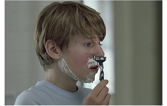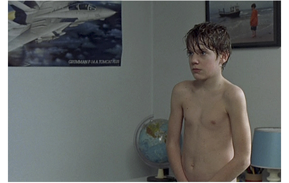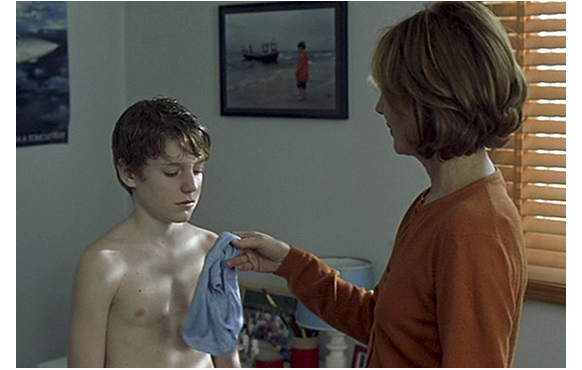 翌朝、ジュリアンがお風呂を出て、自分の部屋に戻り、バスタオルを外して全裸になった時、「急がないと、バスに遅れるわよ」と母が入って来る。思わず両手で前を隠すジュリアン。それを見た母は、「この子ったら…」「何 隠してるの」「え?」「何度も 洗ってあげたでしょ」「手を 外して」「驚くようなものじゃなし」。それでも、隠したままなので、笑顔が消え、置いてあったバスタオルを手に取ると、「さあ!」と言って、隠している手をタオルで叩き、「手を どけて」「何かのゲーム?」「隠し事?」「悪ふざけ?」「私が怖い?」。そして、置いてあったパンツをすばやくつかむと、「手を下ろしなさい!」と強く命じる。しぶしぶ手を放すジュリアン。「ほらね」「難しくないでしょ」とパンツを渡す。部屋を出て行った母の方をじっと見つめ続けるジュリアン。母の異様な支配欲の一端が、思春期を迎えたジュリアンの心を踏みにじったのだ。