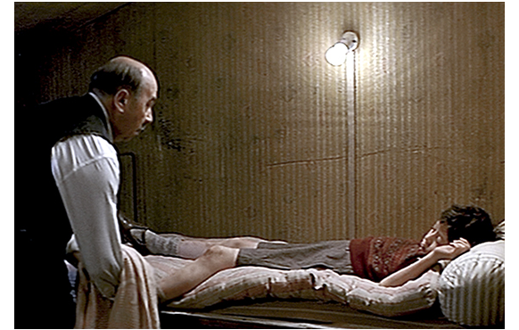 モレルに会いに行ったバティニョールは、話しているうちに、医師が最後に戸棚に隠したものがルノワールの絵だったと教えられる。それが如何に高額っであるかも。バティニョールは、「絵を渡せば、子供を連れていくか?」「イエスかノーか?!」とモレルに迫る。「連れていくが、あんた、無償で危険を冒すのか?」。「無償でだ」。最初の頃と違い、バティニョールは人が変わったように前向きだ。夕方、シモンに食事を持って行った時、「いつ出発?」と訊かれ(1枚目の写真)、「3日以内」と答える。その時、隣の部屋の薄い壁から男女のセックスの音が聞こえてくる。思わず、壁を叩いて「うるさい!」と怒鳴る。しかし、聞こえてきたのは、ドイツ語で怒る声。これは不味いと思い、部屋を飛び出ると、そこには例の大佐がいた。街の女とのセックスを邪魔されて怒る大佐。兄がチフスで部屋にいると弁解し、大佐は慌てて逃げ出すが、大佐のことだから、必ず調べに来ると踏んだバティニョールは、シモンを地下の食料貯蔵庫へ移す(2枚目の写真)。