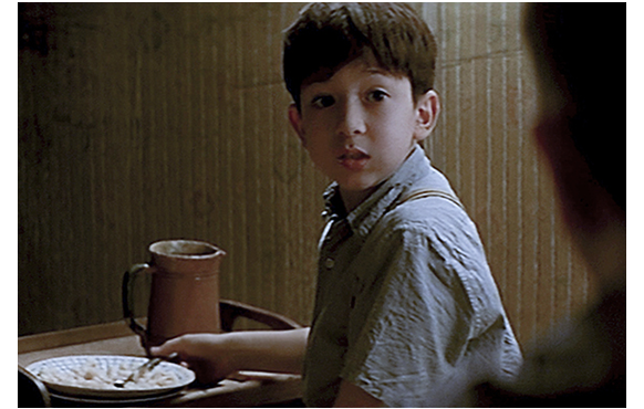 かくして、いよいよパーティが始まる。大佐は、腰巾着化した対独協力者に不平を言っている。「前回の作戦には失望した。3万人のユダヤ人を期待したのに、1万2千人しか逮捕できなかった」。「フランス警察は全力でやっています」。「不十分だ」。協力者になるのも楽ではない。片や鼻つまみされ、片やこき使われる。そこに、玄関の鈴が鳴る。俗物で上昇志向の妻にこき使われ、玄関の応対までさせられるバティニョール。ドアを開けると、暗がりに子供がいる。「パパ、ここにいる?」。「パパって?」。「僕のパパ」。バティニョールは、ようやく相手が誰か分かり、慌ててドアを閉め、廊下の電灯を点ける。「僕の家で何してるの?」(1枚目の写真)。「もう、君の家じゃない」。ドアの隙間から兵士がいるのをチラと見たシモンは、「ドイツ兵?」と訊く。「ピエール=ジャンの友人だ」(2枚目の写真)。ピエール=ジャンは対独協力者のこと。「今はわしの家だ。書類もある。合法だ。悪いが、君の家じゃない」。さらに、「出ていかんと、お互い厄介なことになる」。「何か食べ物もらえない? 3日も食べてない」。罪の意識もあって、バティニョールは女中部屋で食べさせることにする。